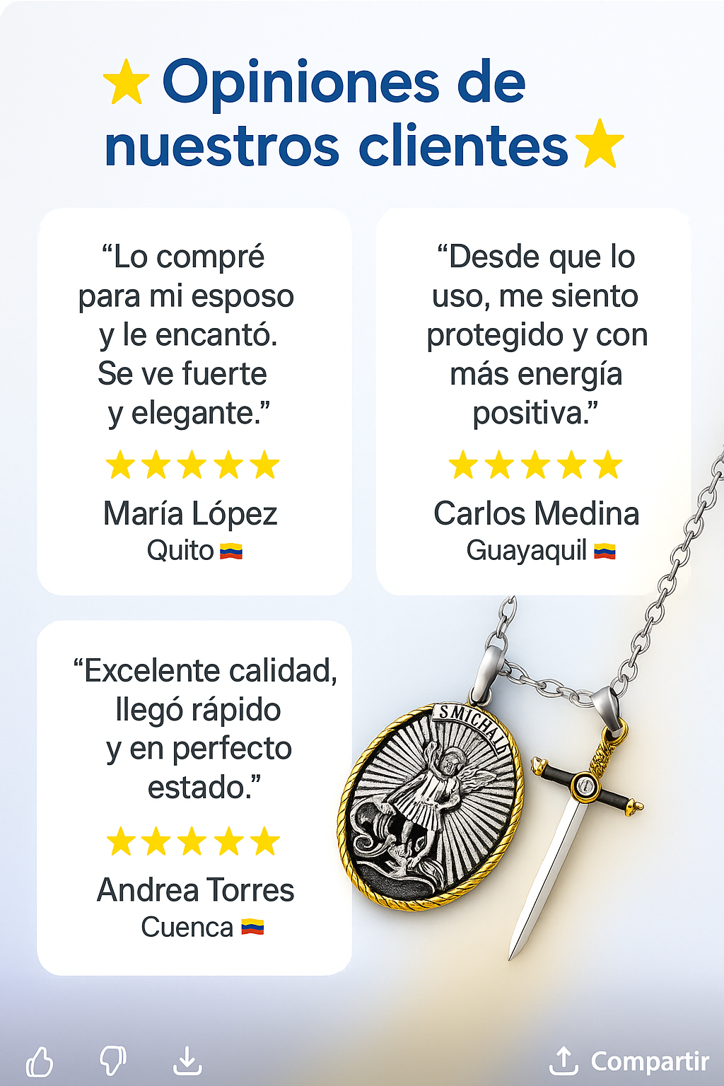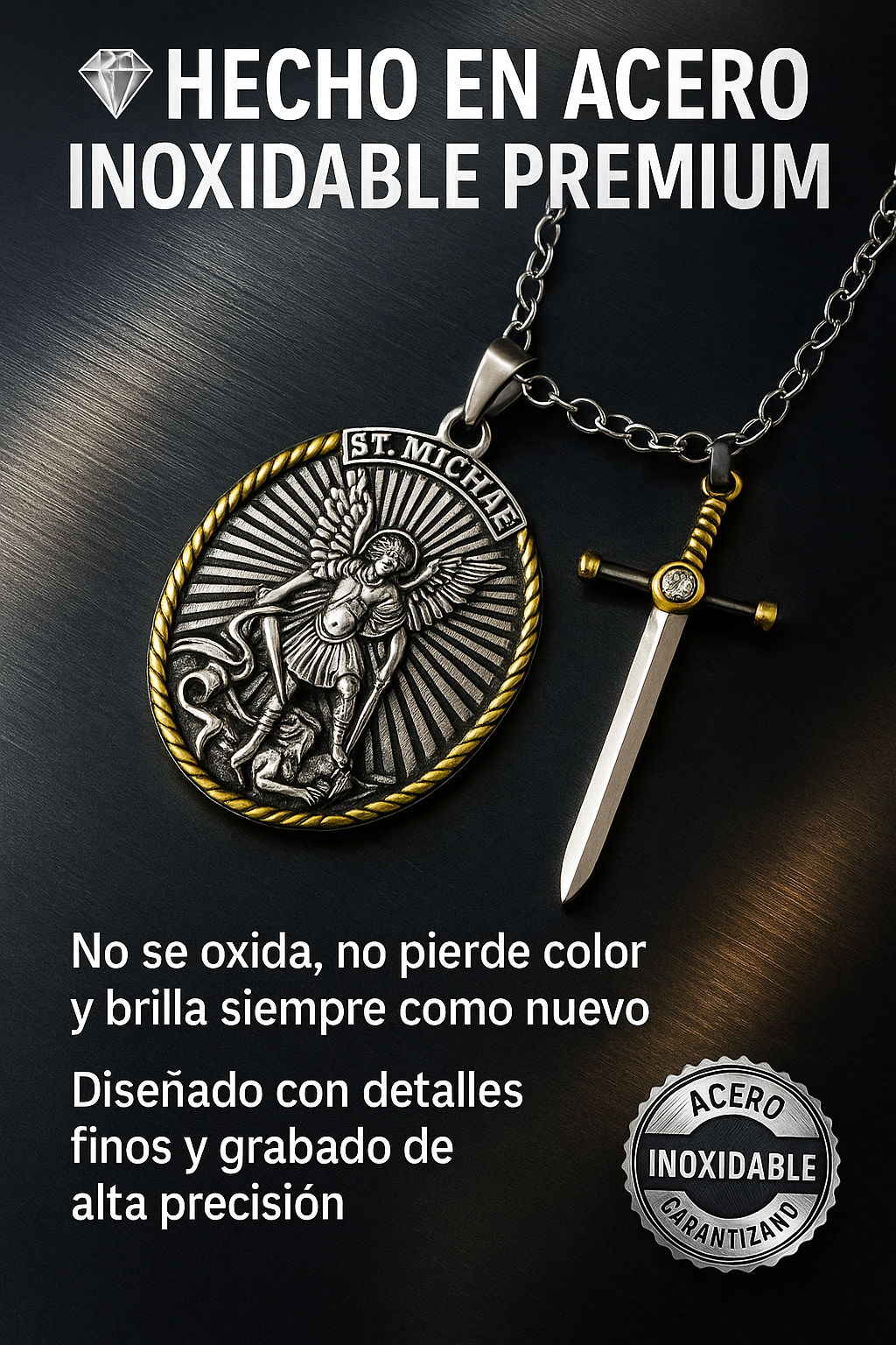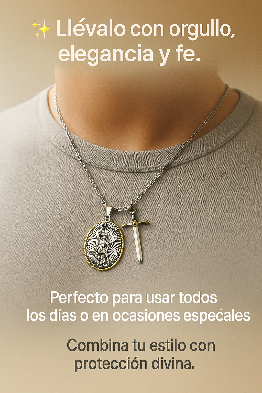 Descubre el poder y la elegancia en una sola joya. Este collar de San Miguel Arcángel no es solo un accesorio, es un símbolo de fe, fuerza y protección espiritual. Fabricado en acero inoxidable premium, resiste al agua, no se oxida ni pierde su brillo, acompañándote en tu día a día con estilo y propósito.