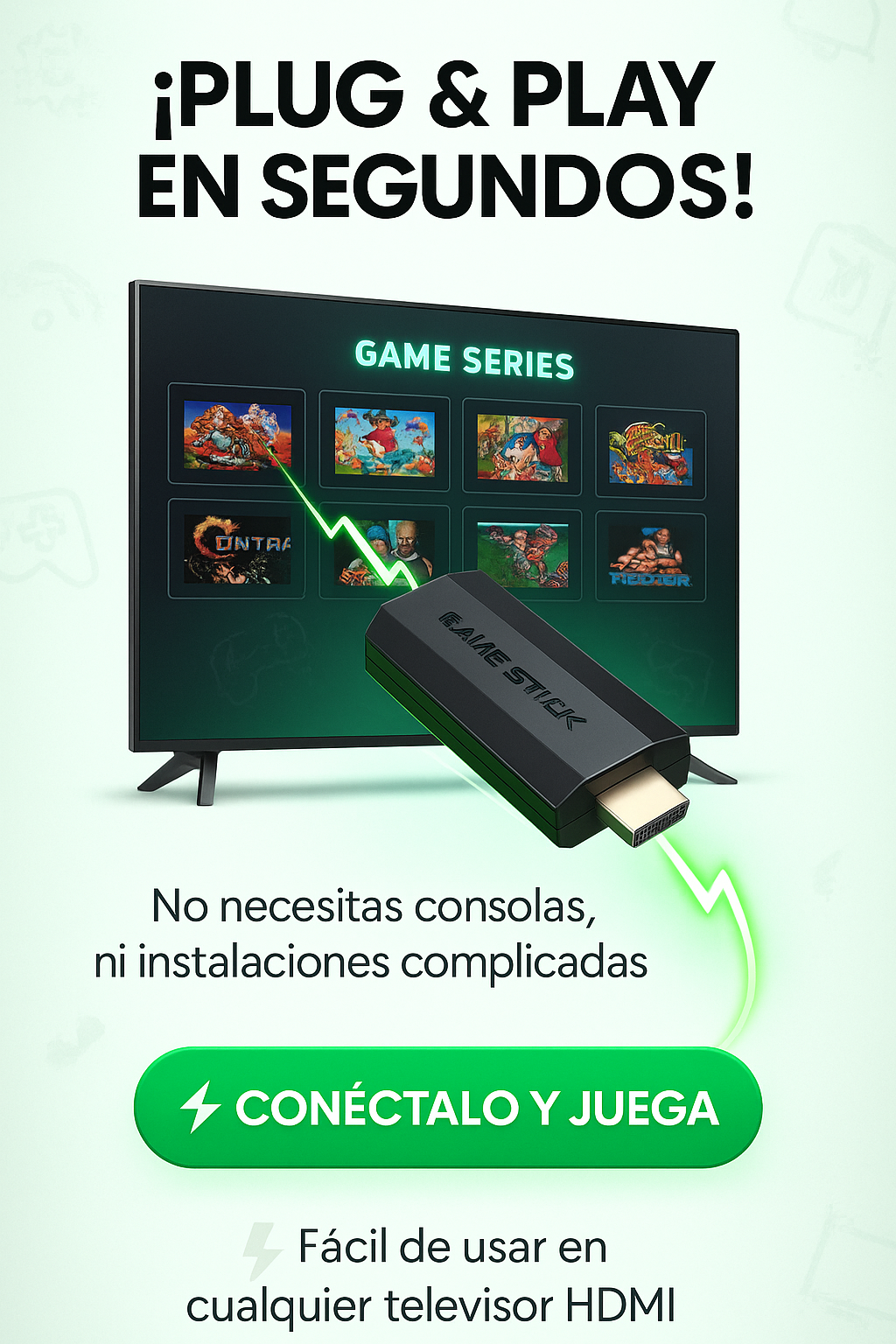 Solo conecta el RetroPlay 4K a tu televisor por HDMI, enciéndelo y selecciona tu emulador favorito (PS1, SNES, Sega, GBA, etc.).