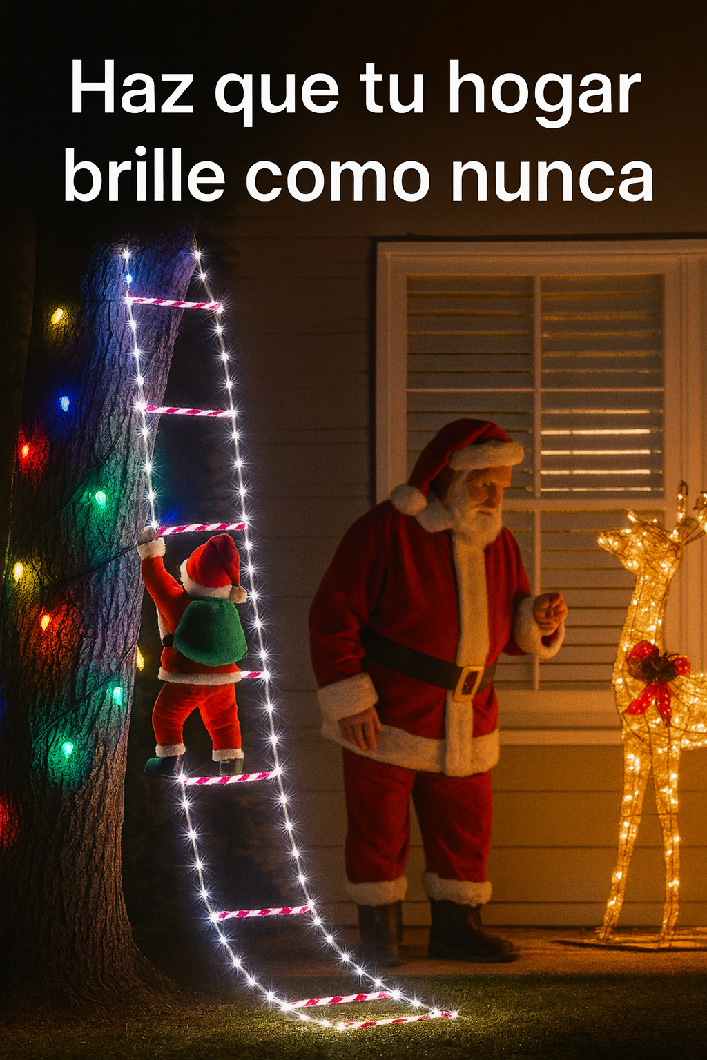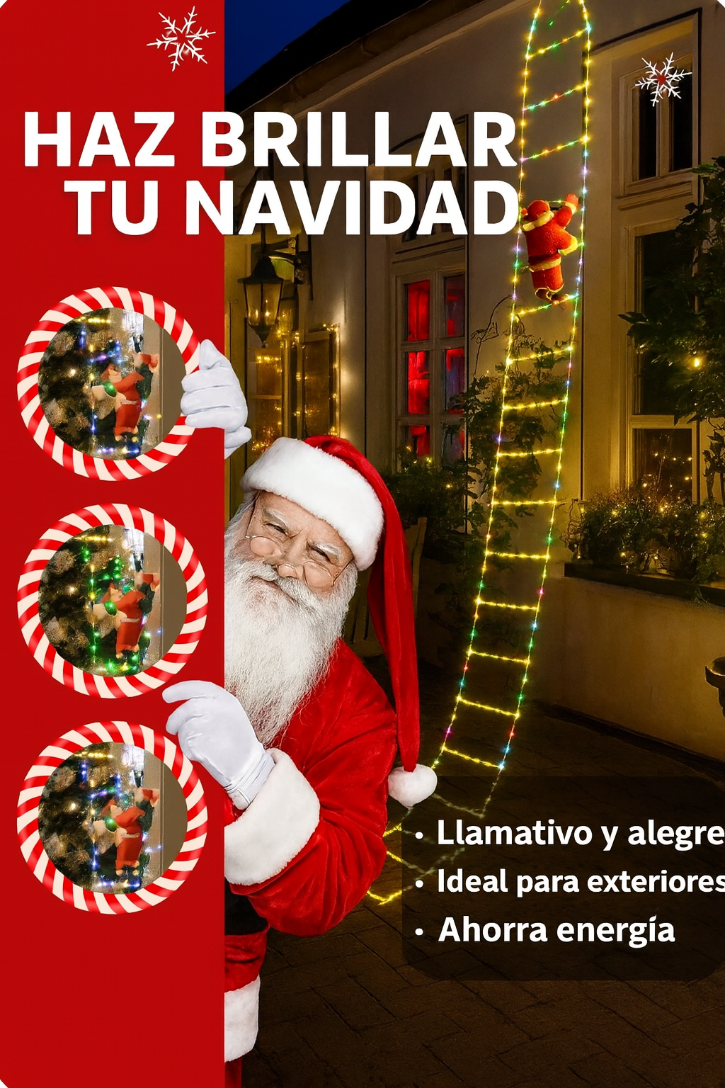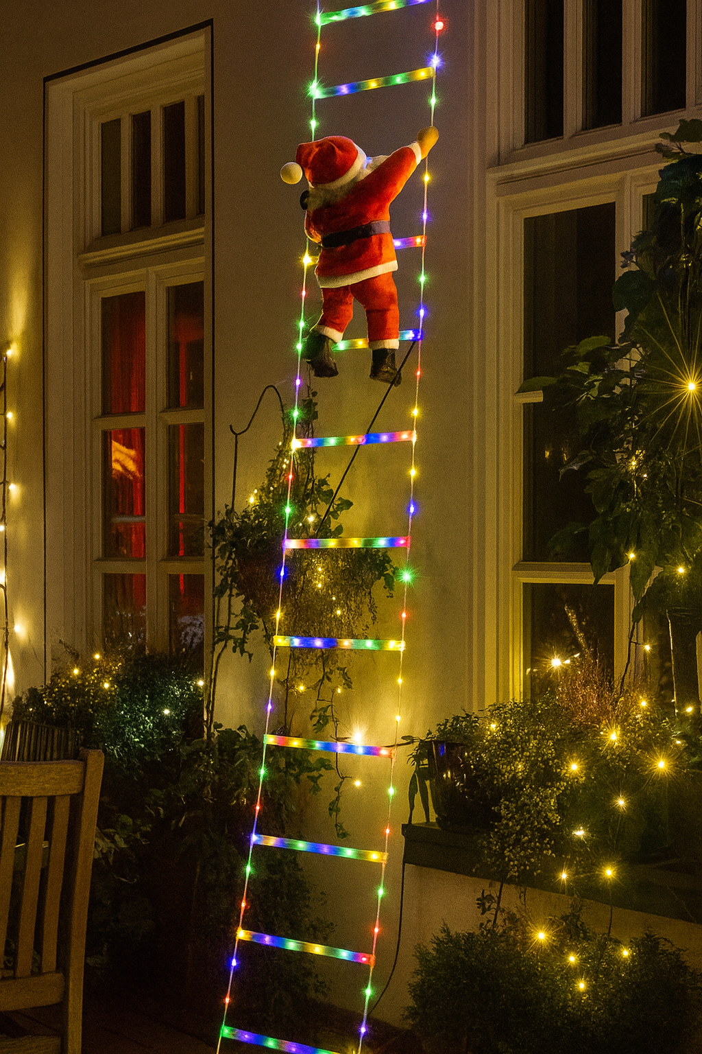 SantaClimb LED es una escalera decorativa con luces LED integradas y un Santa Claus de tamaño realista. Al colgarla en una pared, ventana, balcón o fachada, la iluminación crea un efecto visual festivo que destaca incluso a distancia. Está diseñada con materiales resistentes para soportar temporadas completas.