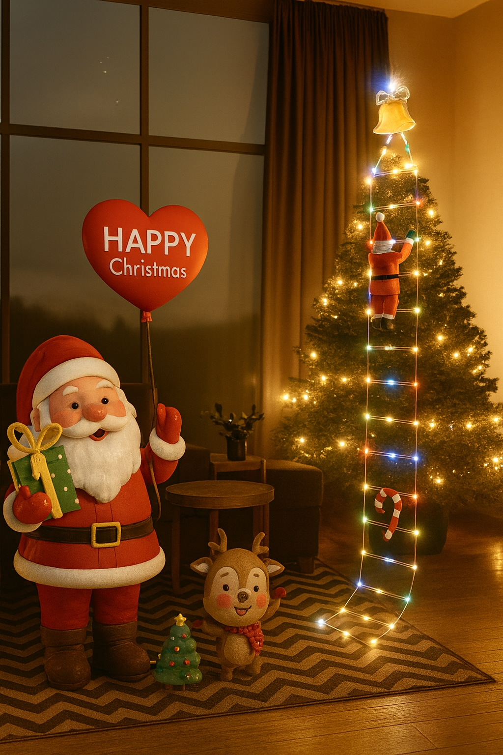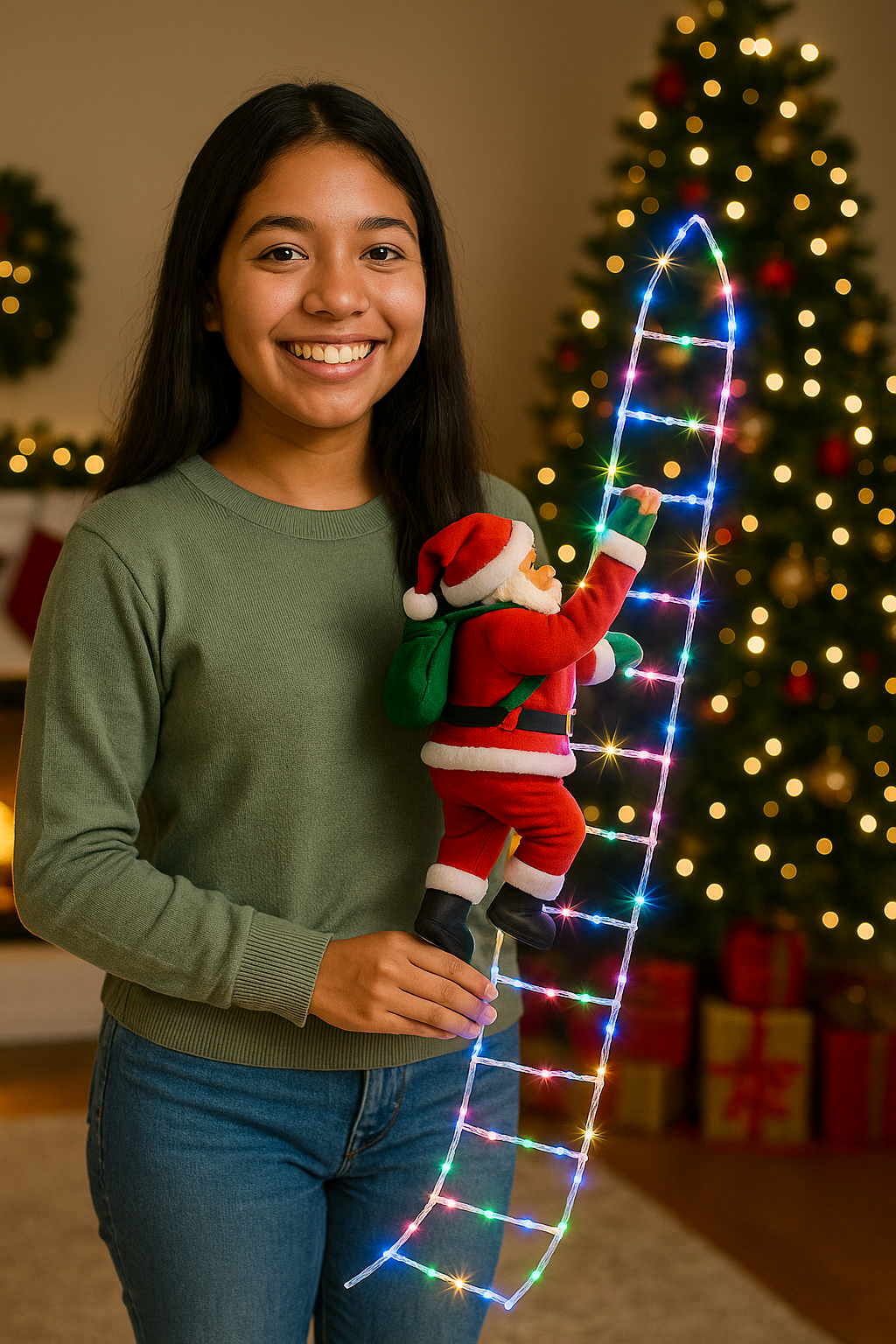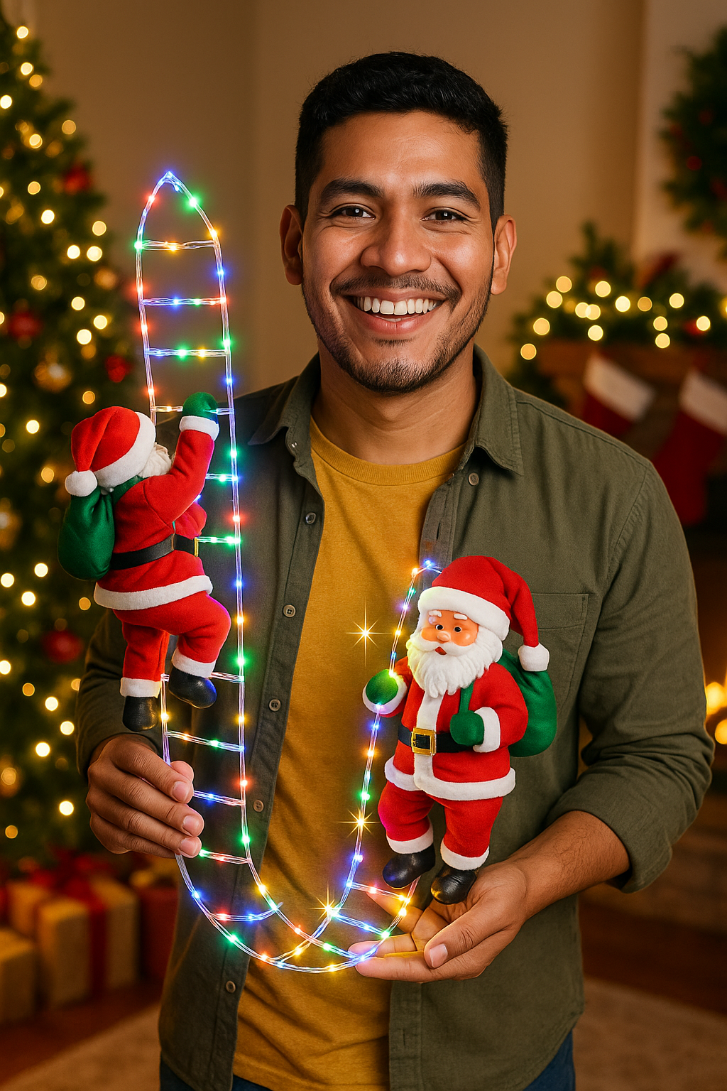 SantaClimb LED es una escalera decorativa con luces LED integradas y un Santa Claus de tamaño realista. Al colgarla en una pared, ventana, balcón o fachada, la iluminación crea un efecto visual festivo que destaca incluso a distancia. Está diseñada con materiales resistentes para soportar temporadas completas.